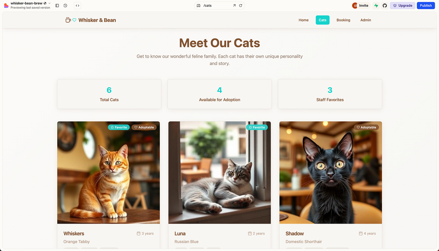 “When I click the ‘Book Now’ button, it goes to a 404 page. Please link it to the Booking page.” Immediately, the button worked. “On the Cats page, show a grid of photos with names and tags.” Lovable restructured the page.
