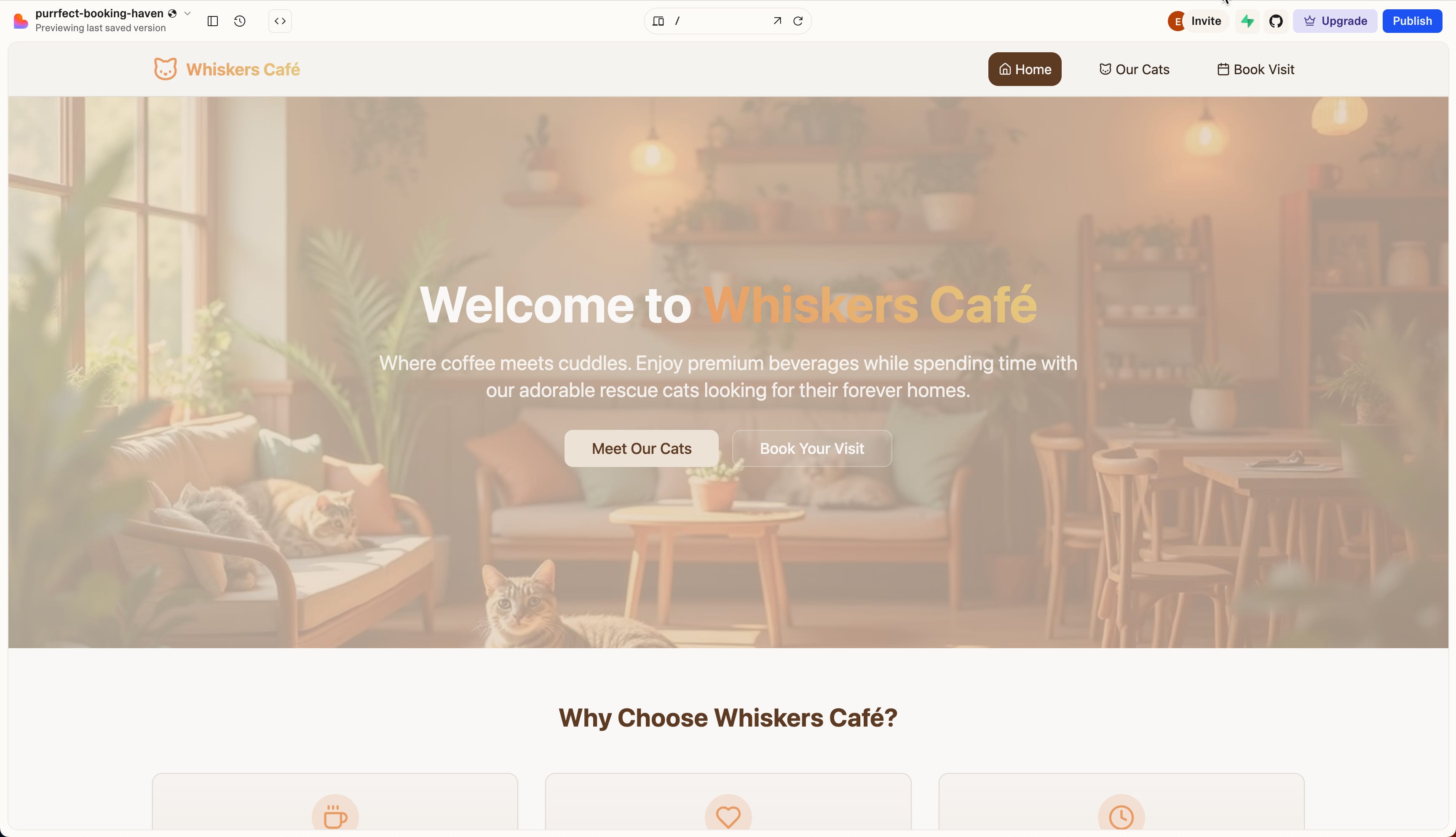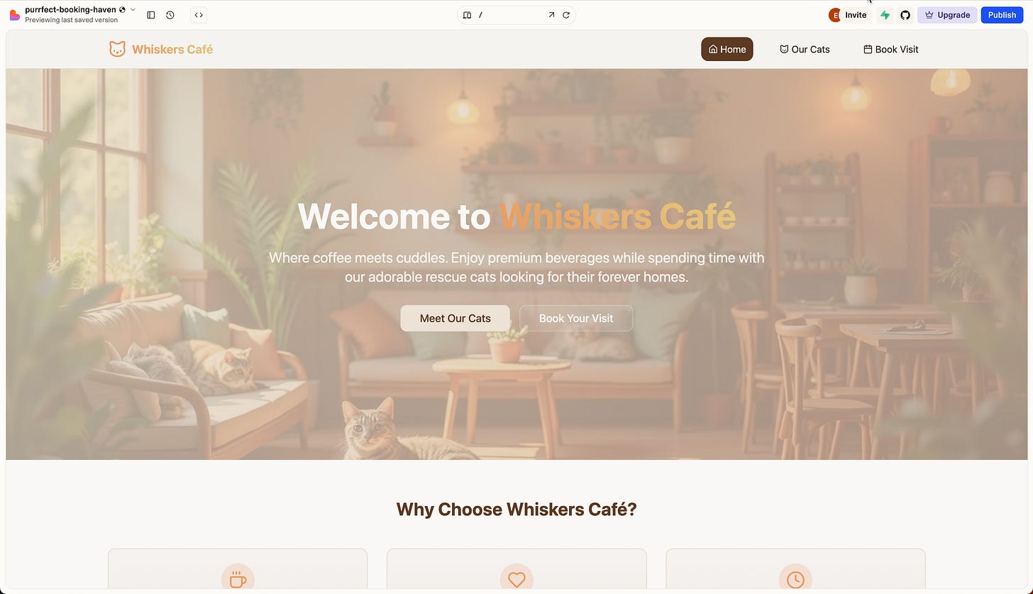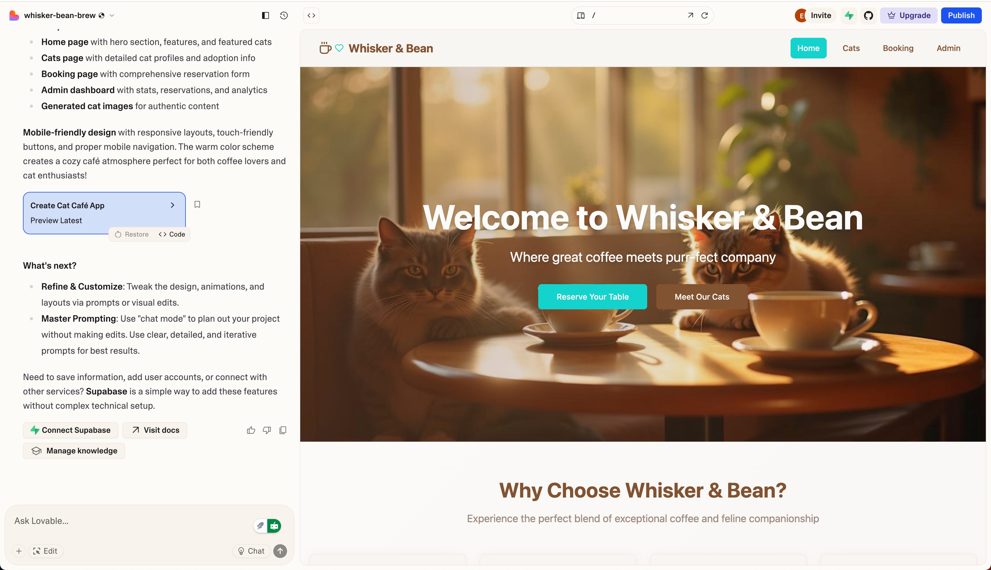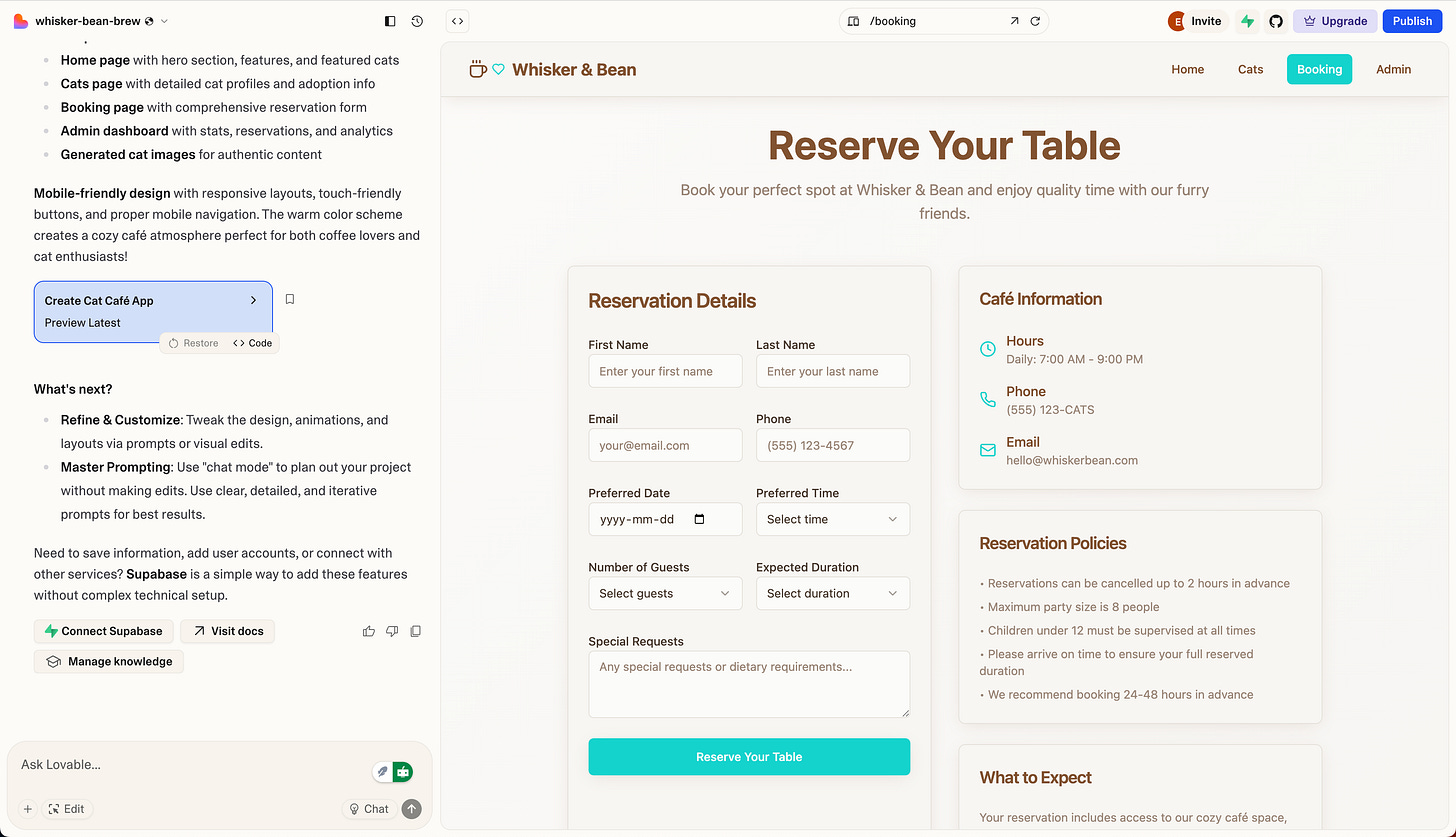 The first prompt I gave Lovable was almost embarrassingly vague: “Create a Cat Café app with Home, Cats and Booking pages.”